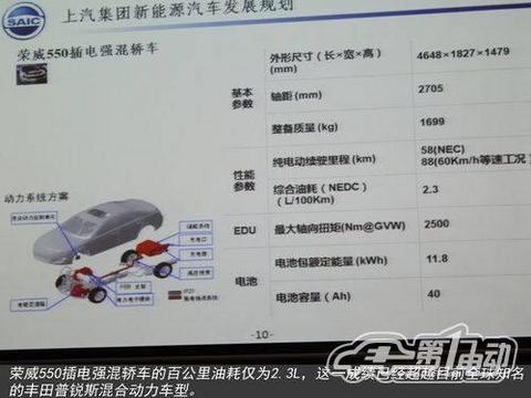 荣威550插电式混合动力轿车是上汽基于自主品牌荣威550 车型,自主开发的混合动力轿车。该车应用了全新自主研发的混合动力系统(包括动力电池系统、电力电子箱、电驱变速箱)、整车电转向系统、电空调系统和热管理系统。与传统荣威550车型相比,该车节油率超过50%,百公里综合油耗仅为2.3L,并满足国5排放标准,已实现量产。