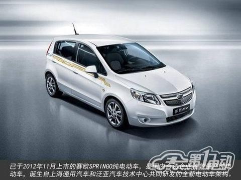 已于2012年11月上市的赛欧SPRINGO纯电动车,是国内合资企业首款量产纯电动车,诞生自上海通用汽车和泛亚汽车技术中心共同研发的全新电动车架构。该车最高车速可至130km/h,综合工况下续航里程超过130公里, 60km/h等速工况的续航里程则可达到200公里。它提供两种不同的充电方式。使用壁挂式充电器和普通家用插座都可为车充电,在220V电压下,最快7小时可充满。其搭载的安吉星Onstar智能行车伙伴(支持手机APP),可实现远程监控车辆状态,监测充电状态,也可以通过手机远程启动车辆,预热空调。
