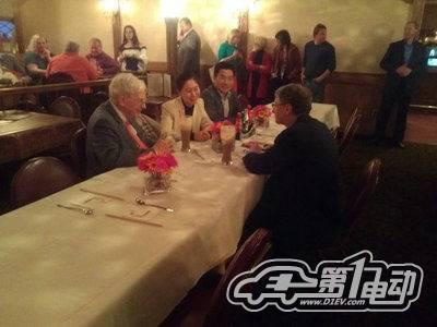 左起为巴菲特、比亚迪海外事业部市场总监李巍及王海涛,右为比尔盖茨