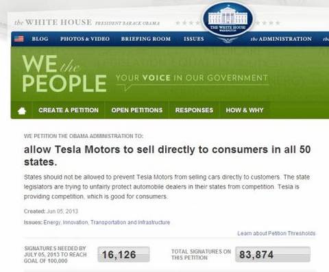 据autobloggreen网站报道,一名男子于6月5日在白宫网站发起了一封请愿书,声称某些州政府以不公正途径阻挠特斯拉直销电动汽车,以保护当地的汽车经销商免受竞争。目前,该请愿书已经获得83874人支持,如果签名人数达到10万,白宫就必须对此作出回应。