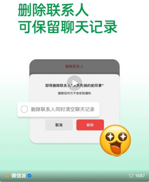其中提到,微信更新好友管理功能。用户可自主选择是否 “删除联系人同时清空聊天记录”,未勾选状态下聊天记录将完整保留,重新添加好友后即可恢复历史对话。