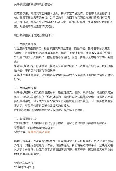 零跑汽车启动"清朗行动" 举报网络黑公关最高奖励500万元