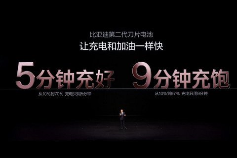 比亚迪通过长期技术积累,解决诸多电动化难题,闪充技术可实现最高1500kW充电功率,达成"5分钟充好,9分钟充饱"——车辆电量从10%充至70%仅需5分钟,从10%充至97%仅需9分钟。