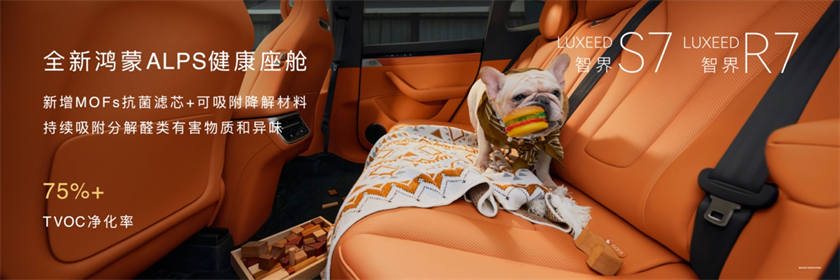 座舱体验进一步升级,新增赤茶橘内饰,营造充满朝气且富有活力的驾乘氛围。智界双7焕新搭载全新鸿蒙ALPS健康座舱,新增MOFs抗菌滤芯与可吸附降解材料,持续吸附分解醛类有害物质和异味,打造“会呼吸”的健康座舱。配合超大空间、丰富储物空间、双零重力座椅 等豪华舒适配置,为用户提供极致出行享受。