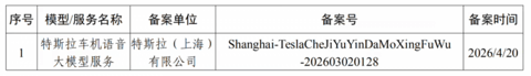 备案信息显示,特斯拉车机语音大模型服务于 4 月 20 日备案,备案单位为特斯拉(上海)有限公司。