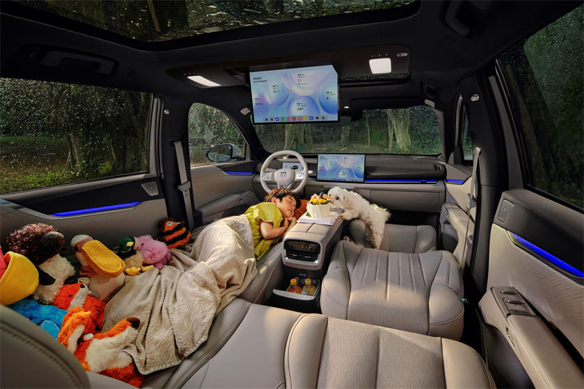 全系标配伊姆斯零重力躺椅与一键成床功能,前排座椅加热、通风、按摩,后排座椅115°-125°电动调节及加热、通风,配合方向盘加热、电动尾门、50W无线充电、20扬声器音响、多色氛围灯。