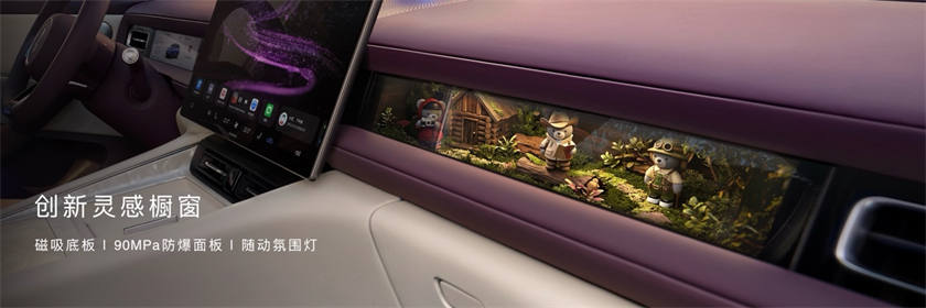 随动中控屏支持左右30度旋转、前后50mm伸缩。配备26.1英寸互动W-HUD,视距4米。副驾灵感橱窗采用磁吸设计,配有随动氛围灯,外部防爆钢化玻璃面板强度90MPa,支持更换墨彩相册、律动香氛等配件。后排可选17.3英寸娱乐屏,全车设10处磁吸点位。
