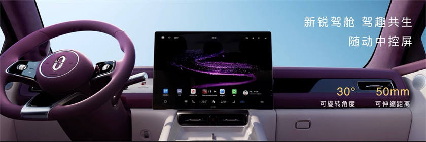 随动中控屏支持左右30度旋转及前后50mm伸缩,配备26.1英寸W-HUD