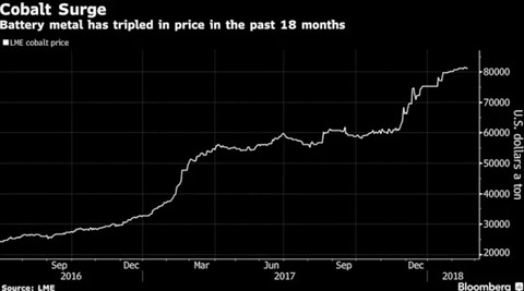 钴价从 2016 年到 2018 年一直上涨,图片来源:彭博社