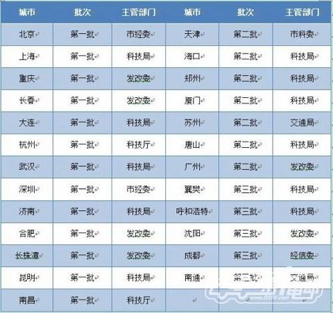 2009年1月23日,科技部、财政部、发改委、工业和信息化部等四部委颁发《关于开展节能与新能源汽车示范推广试点工作的通知》(财建[2009]6号)。在北京、上海、重庆、长春、大连、杭州、济南、武汉、深圳、合肥、长沙、昆明、南昌等13个城市率先开展节能与新能源汽车示范推广试点工作,截止目前示范城市已经达到25个。