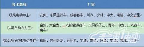 目前新能源客车的技术路线可分为:并联、混联、纯电动和增程式4种。其中并联占了很大部分,厂家主要集中在南车时代电动、东风扬子江(东风电动)、五洲龙、北汽福田、黄海等;采用混联的企业主要有金旅、大金龙、福田、苏州金龙、五洲龙、宇通、申沃等;目前纯电动方面数量较少,主要有安凯客车、比亚迪、中大客车等;增程式作为混合动力与纯电动的”变体”,由于其对电池容量要求降低和成本大幅度下降目前已渐渐为企业所接受,南车、申沃、中通等企业已经研发出增程式客车。