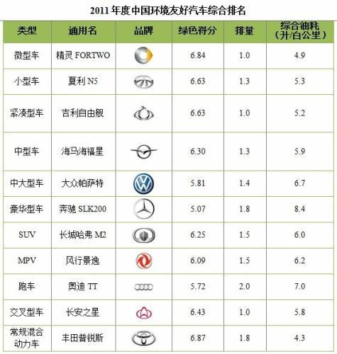 2011年度中国环境友好汽车排行榜