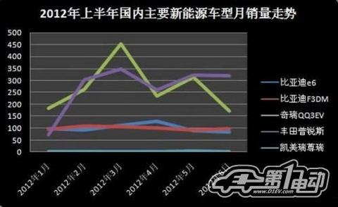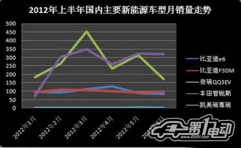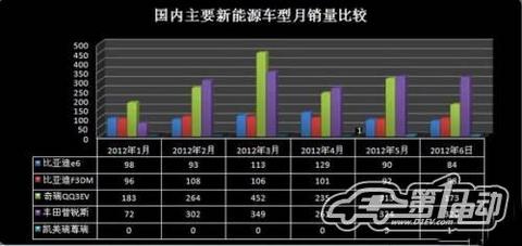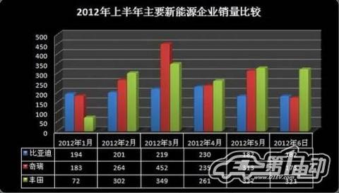 根据中国汽车工业协会数据、电动汽车时代网不完全统计,2012年1至6月,国内主要生产厂商共销售新能源车型4460辆,其中纯电动汽车2227辆,混合动力汽车2237辆。6月份主要生产厂家共销售新能源汽车676辆,较5月份减少146辆;其中纯电动汽车257辆,混合动力汽车419辆。由于受到”5.26”事故电动汽车被撞后起火等多种因素的综合影响下,国内电动乘用车的销量创下了2012年1月以来的新低。