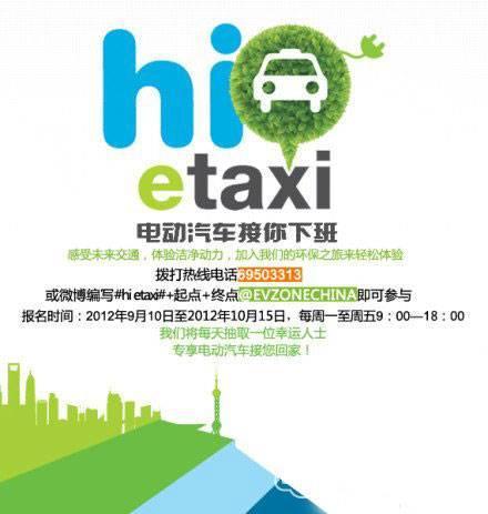 想抢先体验电动汽车的舒适环保吗?想尝试专人接你下班吗?上海市民只需拨打热线电话020-69503313或在微博编写#hi etaxi#+起点+终点@EVZONECHINA即可参与由安亭-上海国际汽车城主办的hi etaxi活动。据了解,此项活动从9月10日持续到10月15日,报名时间为每周一至周五的9:00——18:00。据主办方介绍,每天将有一名”幸运儿”获得”电动汽车接你回家”的专享服务。
