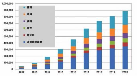 欧洲各国2012-2020年电动车充电设备销售预期: