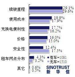 新华信通过以上调查发现,消费者对电动汽车租赁所表现出来的兴趣还是相当大的,七成被访者表达了租赁电动汽车的意愿,并表示使用成本低是他们接受电动汽车的主要原因。从电动汽车的租赁价格来看,试点城市先期推出的电动汽车租赁价格与被访者的期望值差异不大。续航里程是被访者在租赁电动汽车时最看重的因素,同时部分被访者表示不租电动汽车的原因也正是嫌续航里程短。
