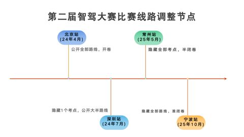 从北京站的“开卷模式”(公开全部路线),到深圳站的“优化半闭卷”(隐藏1个考点,公开大半路线),再到常州站的“半闭卷模式”(隐藏全部考点),赛事线路设计始终紧跟技术发展步伐。而宁波站将正式启用“准闭卷模式”(隐藏全部路线),标志着赛事对智驾技术的检验进入更贴近真实路况的全新阶段!