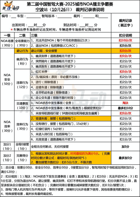 随着赛事影响力持续扩大,参赛车辆数量不断增加,比赛的组织流程、评判规则、记录表也在每一站中进行迭代优化。为进一步提升赛事专业性与公平性,更好适配当前智驾技术发展水平,现决定自10月份起,对赛事规则进行如下调整: