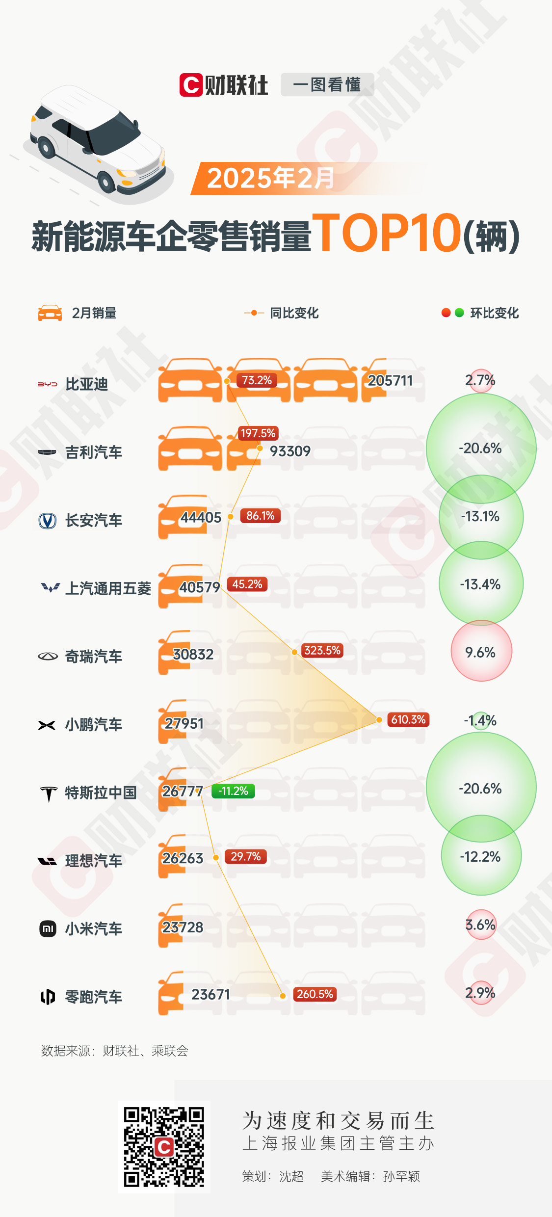 3月12日,2月份国内新能源车市格局变动显著,新能源车企零售销量TOP10榜单出炉。2月新能源狭义乘用车销量68.2万辆,同比增长78.6%,环比下降8.4%。比亚迪以20.57万辆的成绩稳坐零售销量头把交椅,同比增长73.2%,环比微涨2.7%。吉利汽车以9.33万辆的销量位居第二,同比197.5%的大幅增长,但环比下滑20.6%。小鹏汽车以2.80万辆的零售销量位列第六,同比飙升610.3%。特斯拉中国销量延续下滑趋势,2月零售销量为2.68万辆,同比下降11.2%,环比下降22.1%。小米汽车成为2月榜单“新面孔”,2月零售继续保持在2万+辆。鸿蒙智行掉出2月TOP10榜单,2月交付新车2.15万辆,环比下降38.57%。