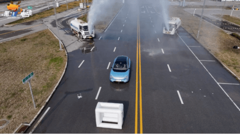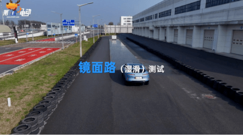 镜面路本身摩擦系数极低,远超普通雨天路面。为挑战极限,我们通过洒水进一步提升湿滑程度,并在路面末端放置静止故障车作为障碍物,测试车辆分别以30km/h、40km/h车速通过(受场地限制,未测试更高车速)。